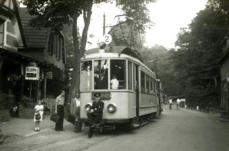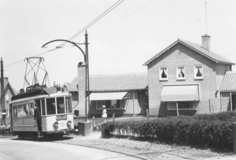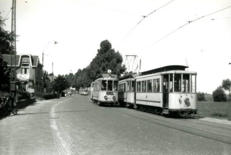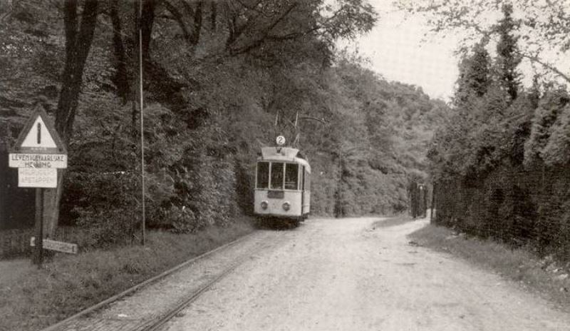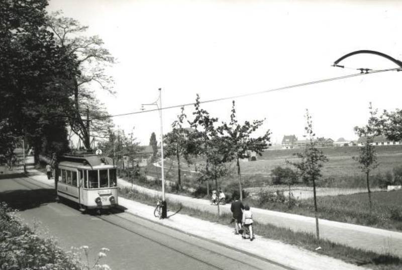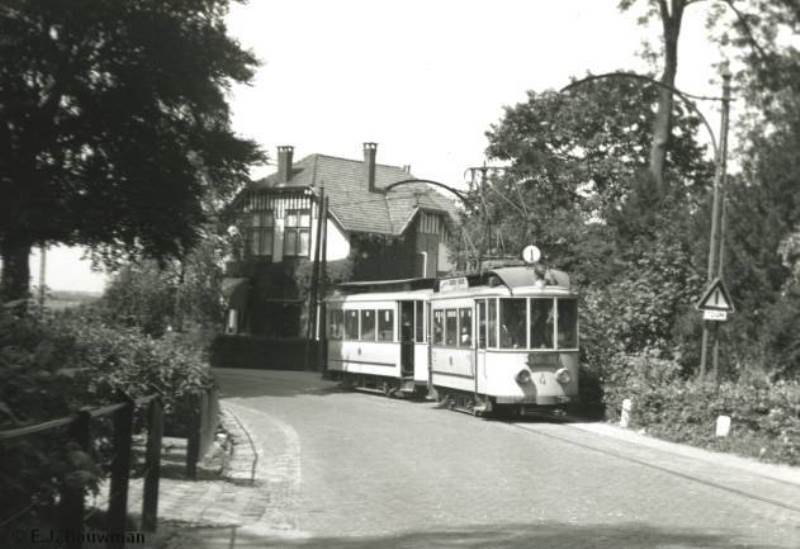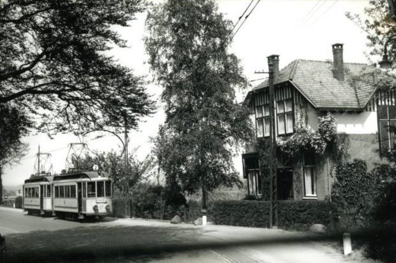 In 1955 is een tramstel, na de S-bocht in de Rijksstraatweg, de links gelegen Oude Holleweg met huize Waalheuvel gepasseerd. Wanneer de Oude Holleweg naar boven beklommen werd, kwam men in Hengstdal uit bij het eindpunt van lijn 1. De bijwagens werden in 1955 niet meer gebruikt, maar bij groter vervoersaanbod koppelde men twee motorwagens aan elkaar, zoals op deze foto is te zien. Foto: E.J. Bouwman.