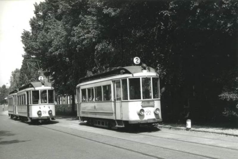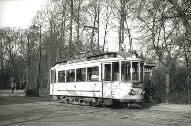Lijn 2 begon oorspronkelijk op het Hunnerpark, maar vanaf 22 september 1952 op het Kelfkensbosch. Wie van het station of uit de stad kwam, diende oorspronkelijk eerst tramlijn 1 en vanaf 22 september 1952 trolleylijn 1 te nemen. We zien boven de achterste bijwagen de trolleybovenleiding hangen, komende vanuit de Hertogstraat.