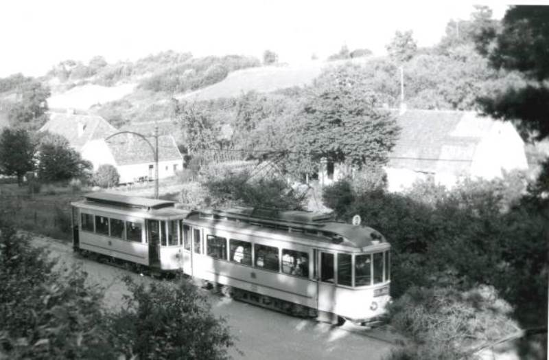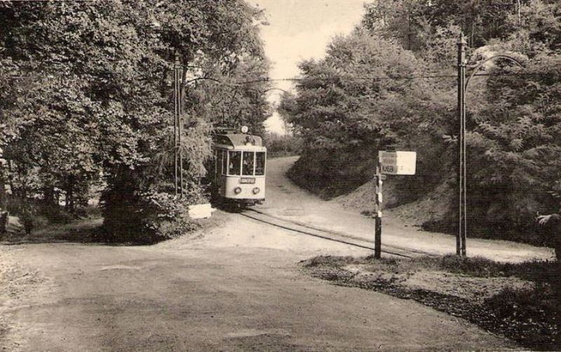 Mw 22 met een bijwagen uit de serie 101 - 106 heeft op 14 augustus 1953 boven op de heuvel het Frans Pensionaat bereikt.