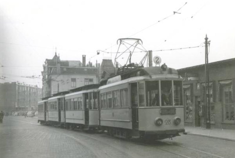 Het is iets voor 10:00 uur op 21 augustus 1954, want we zien mw 28 als 3e dienstwagen op lijn 2 met de bw 101, 102 en 106 het Kelfkensbosh oprijden, waar in dat jaar nog steeds noodwinkels staan. Twee bijwagens zullen bij halte Hunnerpark opgesteld worden om door de beide andere dienstwagens te worden opgepikt, want op het Kelfkensbosch staan ze te veel in de weg. Foto: EJ Bouwman.