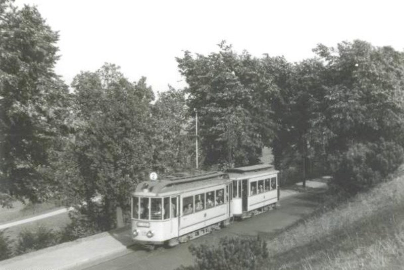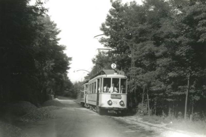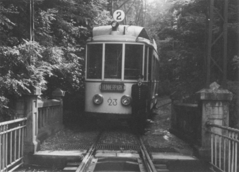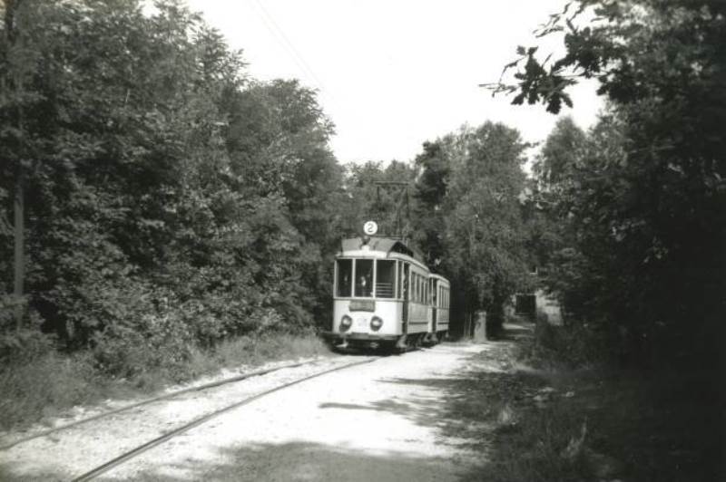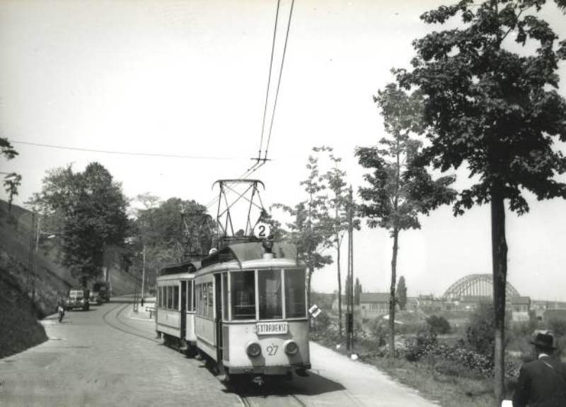 Op 21 juli 1952 is een tramstel van lijn 2 bijna bovenaan de helling van de Nieuwe Ubbergseweg aangekomen op weg naar het Hunnerpark. Vanaf de Nieuwe Ubbergseweg liep de tramlijn tot aan Beek van Nijmegen uit gezien aan de linkerzijde van de weg, dus tegen het verkeer in.