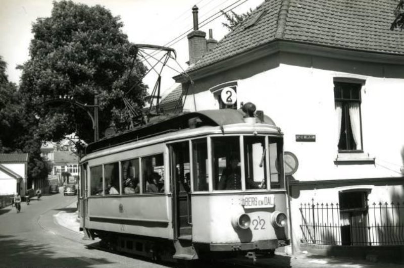 Aan het einde van de Hogeweg komt de tram in Berg en Dal aan. Links komt de steile helling van de Van Randwijckweg omhoog, waarlangs later de gehuurde Crossleybussen van de GTN met huilende motor omhoog moesten zwoegen. De tramrails zijn hier nog geruime tijd na de opheffing blijven liggen. Jaartal en fotograaf onbekend.
