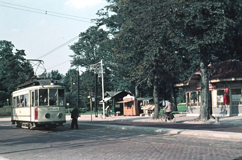 Motorwagen 27 van lijn 2 staat in september 1955 aan de halte Hunnerpark klaar voor vertrek naar Berg en Dal. De rails van lijn 1 zijn verwijderd; er ligt alleen nog een omloopspoor voor lijn 2. De halte was een vluchtheuvel midden op straat. De tram staat op het weggedeelte staduitwaarts, terwijl het verkeer vanaf het Keizer Lodewijkplein stadinwaarts op het weggedeelte tussen de tram en het wachthuisje moet door rijden. Het wachthuisje rechts bestaat nog steeds en doet, zij het een kwart slag gedraaid, dienst als kiosk. Foto: JGJ van Lith.