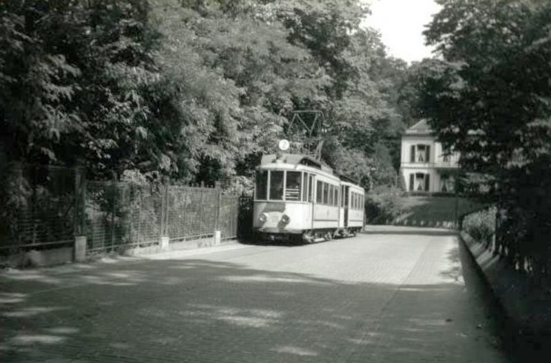 Op 21 juli 1952 is motorwagen 4, geleend van lijn 1, met een grote bijwagen uit de serie 101 - 106 juist Villa Bergzicht gepasseerd en begint aan de klim naar huize Waalheuvel. Aan de trammast is één van de lichtbakken te zien, die het verkeer moesten waarschuwen voor de komst van de tegen het verkeer in rijdende tram. Foto: E.J. Bouwman.