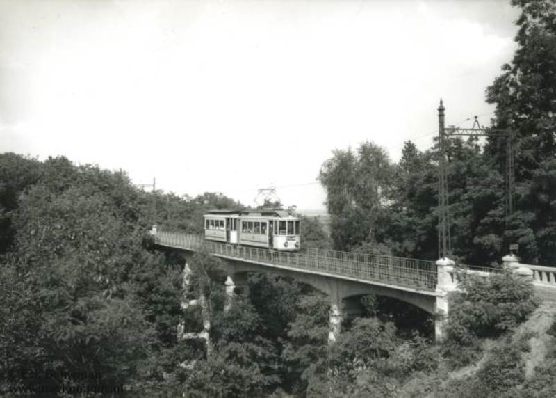 Op het viaduct, waaraan het Bergspoor haar faam dankte, werd meestal even gestopt om de passagiers van het uitzicht te laten genieten. Een tramstel rijdt op 17 augustus 1954 op het bergspoorviaduct in de richting van Berg en Dal. Foto: E.J. Bouman.