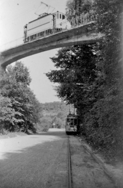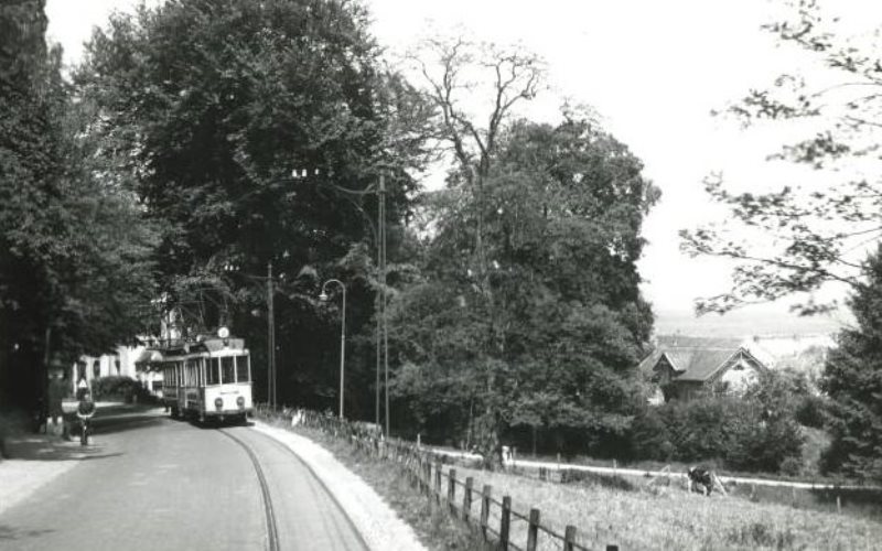 Na een bocht van een halve cirkel voor de uitspanning langs op de Sterrenberg, rijdt de tram met mw 29 op 21 juli 1952 over de Ooster Bergweg naar het landhoofd van het viaduct. Aan de (op de foto) linkerzijde van de weg staat nog steeds een goed onderhouden trammast op particulier terrein. Foto: E.J. Bouwman.