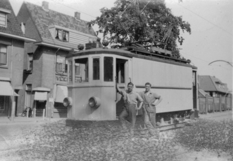 En hier staat de railreiniger op het wisselspoor in de Van Randwijkweg voor het onderstation aan het begin van de klim naar Berg en Dal. Voor het begin van de dienst reed de wagen een poetsrit over het bergspoor. Datum en fotograaf onbekend.