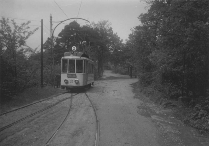 In de Wester Bergweg lag de wisselplaats Parkwacht. Op de Sterrenberg, op de achtergrond zichtbaar, boog de tram voor de uitspanning met uitzichttoren langs met een scherpe boog naar rechts naar de Ooster Bergweg . We zien motorwagen 28 ca 1930. Fotograaf onbekend.