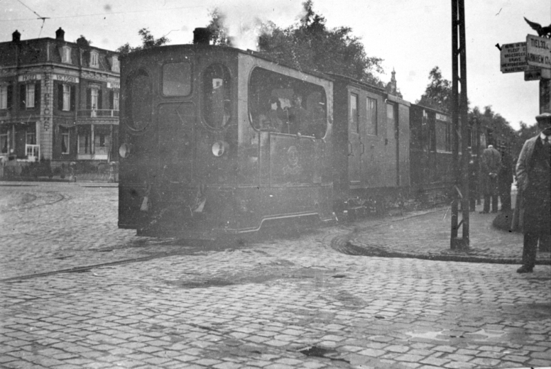 Een onduidelijke foto, maar toch de moeite waard om te plaatsen. Een stoomtram van de Maas en Waal zet flink aan om de helling in de Nieuwe Marktstraat te kunnen overwinnen. De Backertjes van de M&W waren in verband met deze helling sterker, dan voor de rest van het traject in het Land van Maas en Waal noodzakelijk zou zijn geweest. Rechts het spoor van GTN lijn 3 en op de voorgrond, direct achter de handkar, is vaag het kruisende spoor van de kolentram te zien. Fotograaf onbekend.