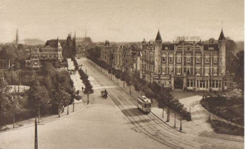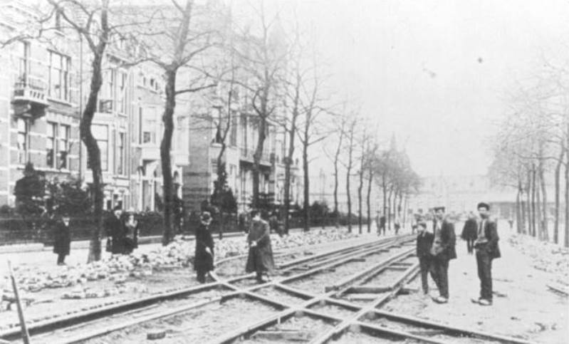 Oorspronkelijk liep de stoomtramlijn vanaf het station aan de rechterzijde van de Spoorstraat. Zoals te zien op deze foto tijdens de aanleg van de Gemeente Tram, kruiste de stoomtram het dubbelspoor van de GTN bij het inrijden van de Stieltjesstraat. De GTN reed oorspronkelijk voorlangs het station en daarna met een grote boog terug naar de noordelijke baan van de Van Schaeck Mathonsingel, waarbij de sporen van de stoomtram nogmaals gekruist werden. Zie het kaartje hierboven. Fotograaf onbekend.