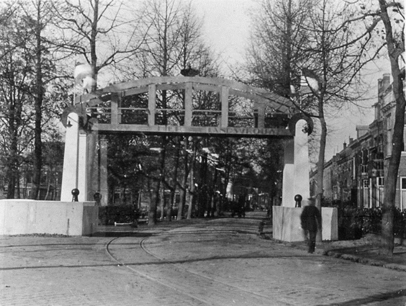 Het tramspoor van de M&W slaat vervolgens vanaf de Voorstadslaan (rechts) de Weurtseweg in. De feestelijke boog is opgesteld naar aanleiding van de opening van het Maas - Waalkanaal; dit dateert de foto op 1926. De electrische lijn 3 reed toen al drie jaar en de rails zijn op de foto heel vaag te zien van rechts naar links lopend de stoomtramlijn kruisend op de voorgrond. Fotograaf onbekend.