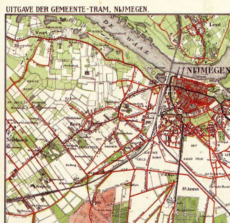 Op deze kaart zien we het westelijke gedeelte van de GTN tramlijn 1 als zwarte lijn. Duidelijk is te zien dat de lijn oorspronkelijk voor het station langs een grote lus maakte; dit komt verderop in de tekst nog ter sprake. Minder duidelijk te zien zijn de stoomtramlijnen naar Neerbosch en naar Weurt, als gestippelde lijn in de rode weg. Het Maas - Waalkanaal is nog niet gegraven en de Weurtseweg heette buiten de stad de Koningstraat. In de kern van Weurt werd dit later de Pastoor van de Marckstraat. Ter orientatie: linksboven zien we de Jonkerstraat in de Koningstraat uitmonden. Na de bouw van het kanaal met de hefbrug over de sluis, is de tramlijn een stuk zuidelijker over de nieuwe Van Heemstraweg gelegd, waar de nieuw aangelegde oprit in de Weurtseweg in Nijmegen dan weer op aansloot.